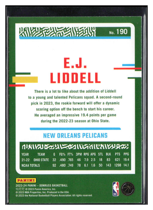 This is a nice example of a 2023-24 Donruss #190 E.J. Liddell Red Laser Holo Other important information about this card:SNIn 2023 E.J. Liddell played for the New Orleans Pelicans.Please...