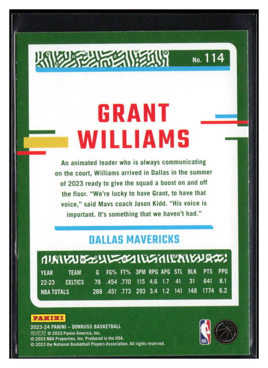 This is a nice example of a 2023-24 Donruss #114 Grant Williams Purple Press Proof Other important information about this card:SNIn 2023 Grant Williams played for the Dallas Mavericks.Please check...