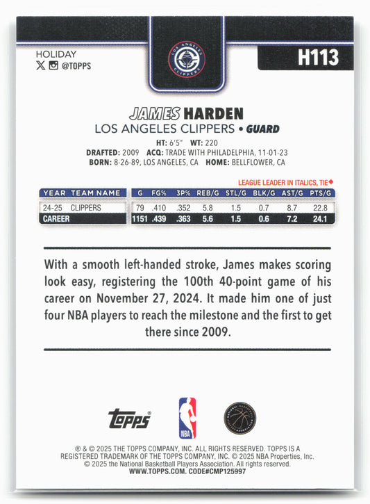 This is a nice example of a 2025-26 Topps Holiday #H113 James Harden Other important information about this card:In 2025 James Harden played for the Los Angeles Clippers.Please check out...