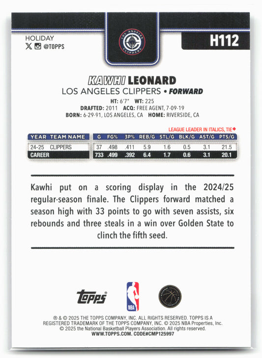 This is a nice example of a 2025-26 Topps Holiday #H112 Kawhi Leonard Other important information about this card:In 2025 Kawhi Leonard played for the Los Angeles Clippers.Please check out...
