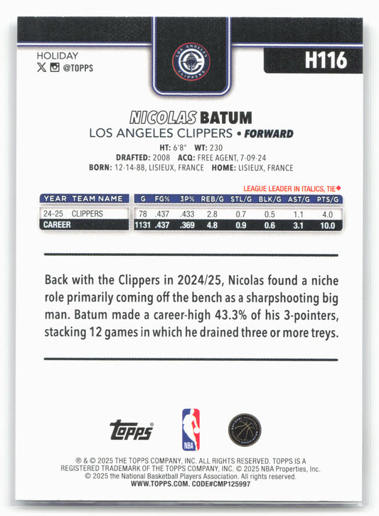 This is a nice example of a 2025-26 Topps Holiday #H116 Nicolas Batum Other important information about this card:In 2025 Nicolas Batum played for the Los Angeles Clippers.Please check out...