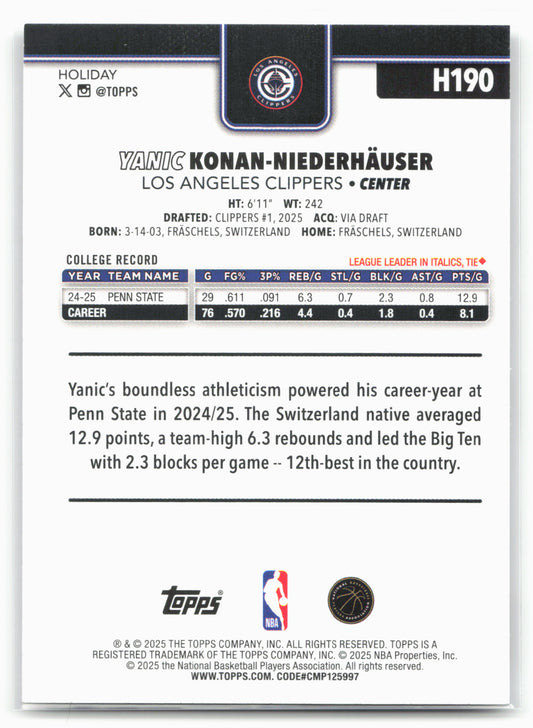 This is a nice example of a 2025-26 Topps Holiday #H190 Yanic Konan Niederhauser Other important information about this card:RCIn 2025 Yanic Konan Niederhauser played for the Los Angeles Clippers.Please...