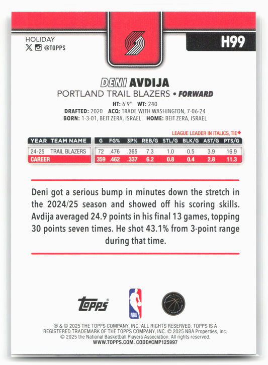This is a nice example of a 2025-26 Topps Holiday #H99 Deni Avdija Other important information about this card:In 2025 Deni Avdija played for the Portland Trail Blazers.Please check out...