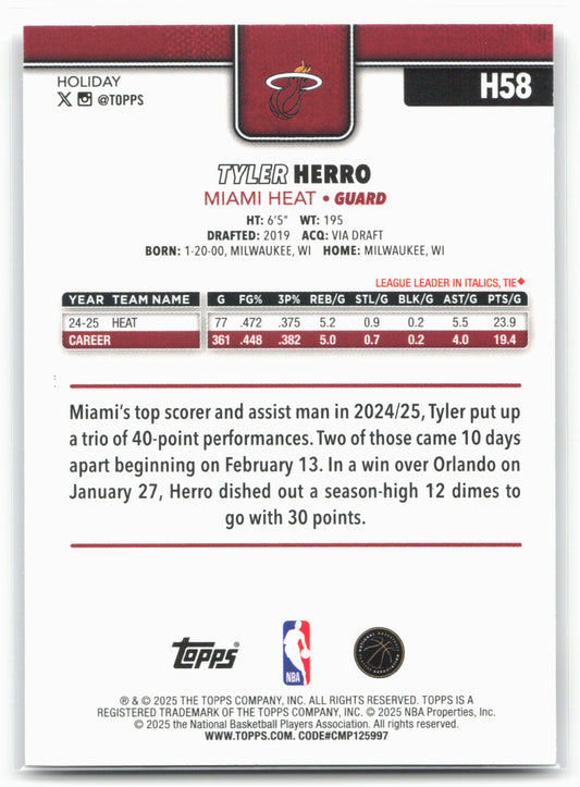This is a nice example of a 2025-26 Topps Holiday #H58 Tyler Herro Other important information about this card:In 2025 Tyler Herro played for the Miami Heat.Please check out our...