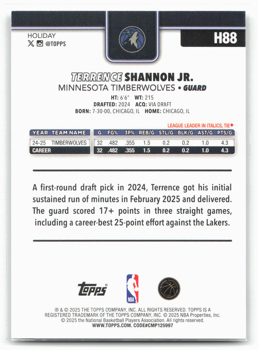 This is a nice example of a 2025-26 Topps Holiday #H88 Terrence Shannon Jr. Other important information about this card:In 2025 Terrence Shannon Jr. played for the Minnesota Timberwolves.Please check...