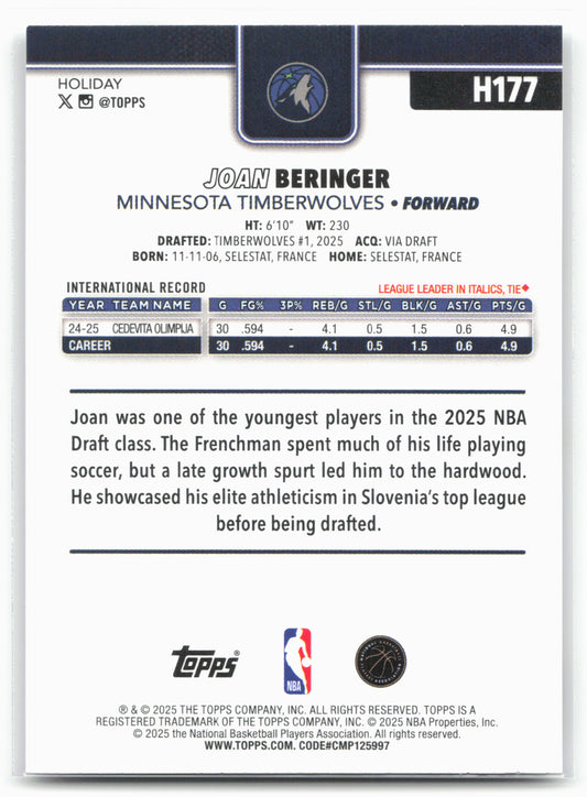 This is a nice example of a 2025-26 Topps Holiday #H177 Joan Beringer Other important information about this card:RCIn 2025 Joan Beringer played for the Minnesota Timberwolves.Please check out our...