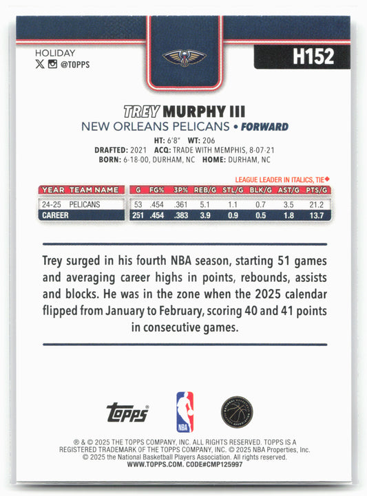 This is a nice example of a 2025-26 Topps Holiday #H152 Trey Murphy III Other important information about this card:In 2025 Trey Murphy III played for the New Orleans Pelicans.Please...