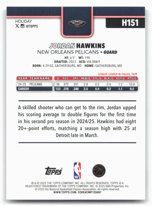 This is a nice example of a 2025-26 Topps Holiday #H151 Jordan Hawkins Other important information about this card:In 2025 Jordan Hawkins played for the New Orleans Pelicans.Please check out...