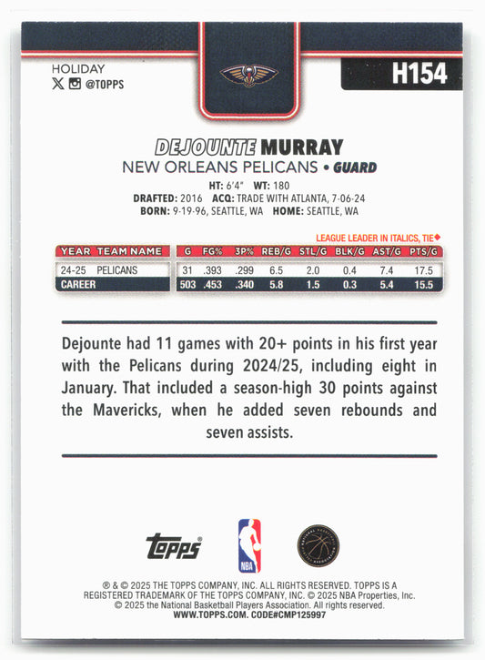 This is a nice example of a 2025-26 Topps Holiday #H154 Dejounte Murray Other important information about this card:In 2025 Dejounte Murray played for the New Orleans Pelicans.Please check out...