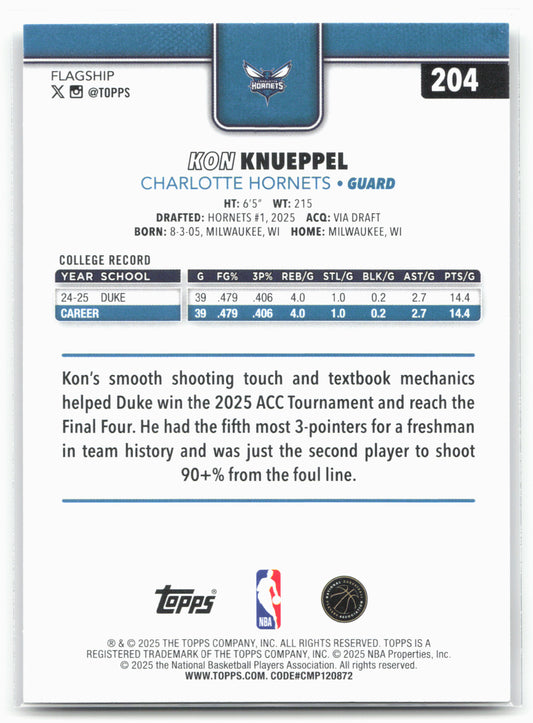 This is a nice example of a 2025-26 Topps #204 Kon Knueppel Other important information about this card:25802RCIn 2025 Kon Knueppel played for the Charlotte Hornets.Please check out our other...