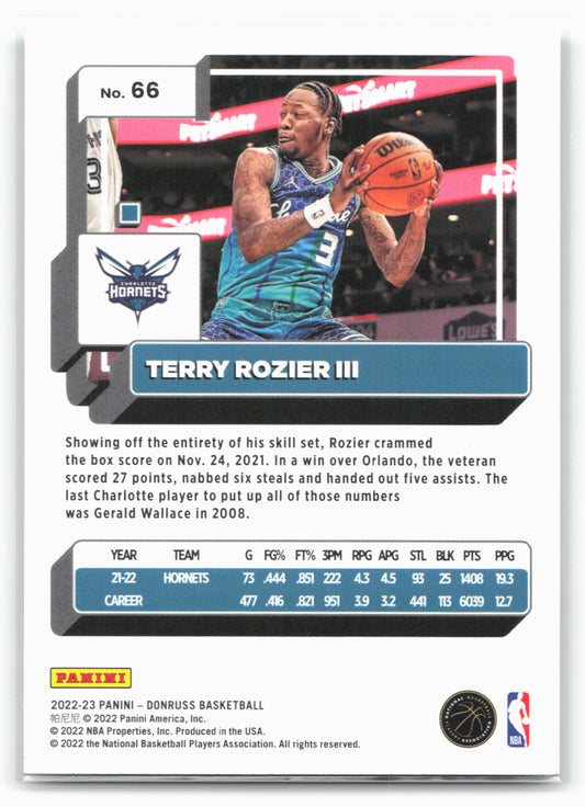 This is a nice example of a 2022-23 Donruss #66 Terry Rozier III Holo Laser Green Other important information about this card:In 2022 Terry Rozier III played for the Charlotte...