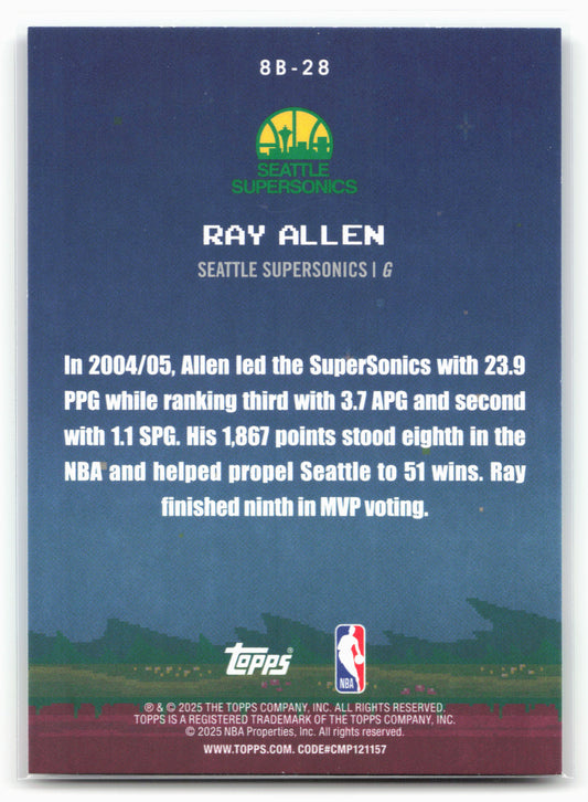 This is a nice example of a 2025-26 Topps #8B-28 Ray Allen 8-Bit Ballers Other important information about this card:25779In 2025 Ray Allen played for the Sonics.Please check out our...