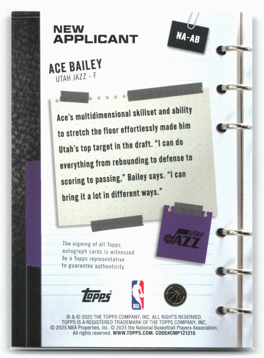 This is a nice example of a 2025-26 Topps #NA-AB Ace Bailey New Applicants Autographs Other important information about this card:25782AUIn 2025 Ace Bailey played for the Utah Jazz.Please check...