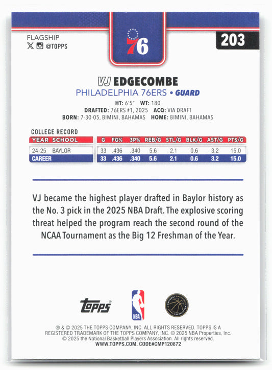 This is a nice example of a 2025-26 Topps #203 VJ Edgecombe Other important information about this card:25787RCIn 2025 VJ Edgecombe played for the Philadelphia 76ers.Please check out our other...