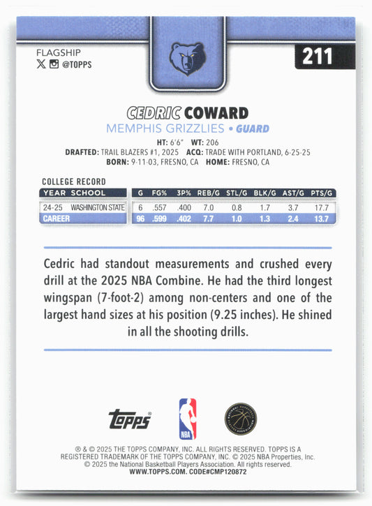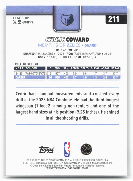 This is a nice example of a 2025-26 Topps #211 Cedric Coward Other important information about this card:25791RCIn 2025 Cedric Coward played for the Memphis Grizzlies.Please check out our other...