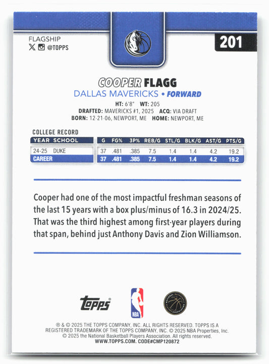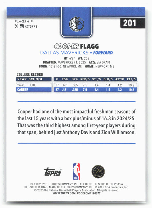 This is a nice example of a 2025-26 Topps #201 Cooper Flagg Other important information about this card:25797RCIn 2025 Cooper Flagg played for the Dallas Mavericks.Please check out our other...