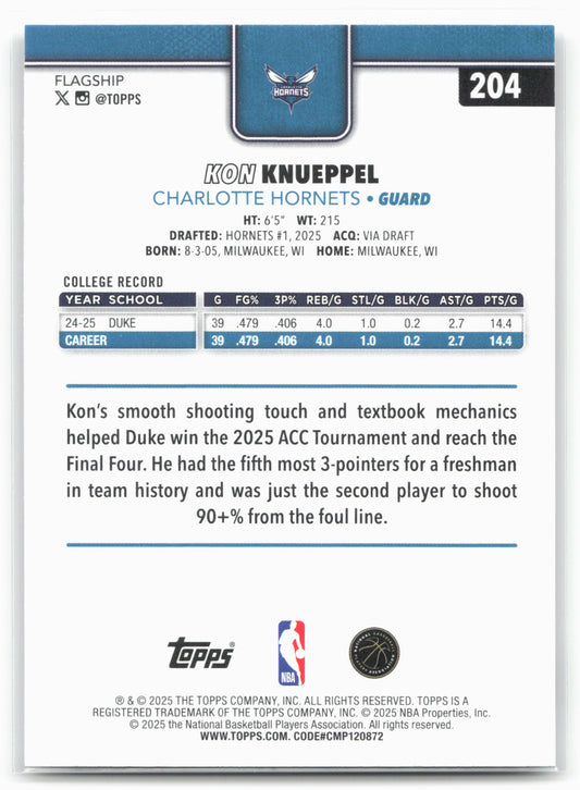 This is a nice example of a 2025-26 Topps #204 Kon Knueppel Other important information about this card:25799RCIn 2025 Kon Knueppel played for the Charlotte Hornets.Please check out our other...