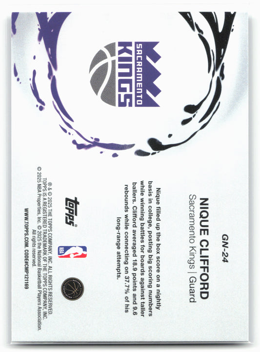 This is a nice example of a 2025-26 Topps #GN-24 Nique Clifford Generation Now Other important information about this card:25753In 2025 Nique Clifford played for the Sacramento Kings.Please check out...