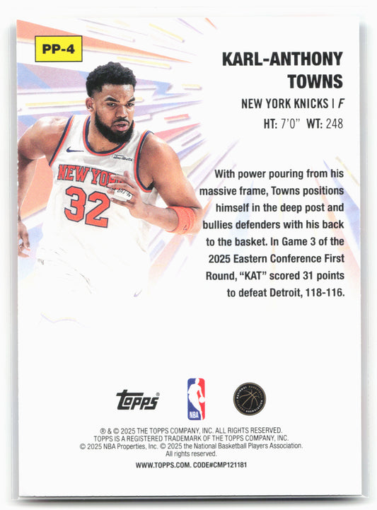 This is a nice example of a 2025-26 Topps #PP-4 Karl-Anthony Towns Power Players Other important information about this card:25755In 2025 Karl-Anthony Towns played for the New York Knicks.Please check...