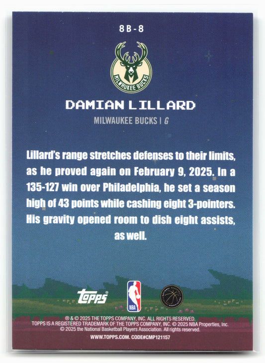 This is a nice example of a 2025-26 Topps #8B-8 Damian Lillard 8-Bit Ballers Other important information about this card:25761In 2025 Damian Lillard played for the Milwaukee Bucks.Please check out...