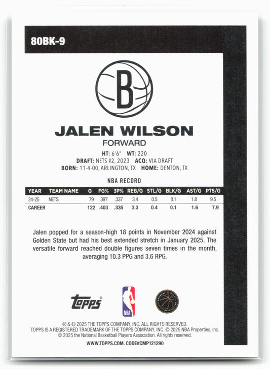 This is a nice example of a 2025-26 Topps #80BK-9 Jalen Wilson 1980-81 Topps Basketball Other important information about this card:25772In 2025 Jalen Wilson played for the Brooklyn Nets.Please check...