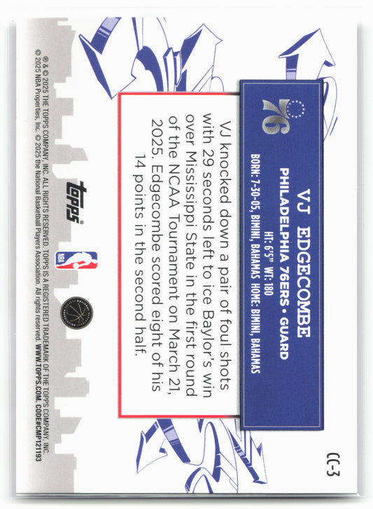 This is a nice example of a 2025-26 Topps #CC-3 VJ Edgecombe Clutch City Prospects Other important information about this card:25776In 2025 VJ Edgecombe played for the Philadelphia 76ers.Please check...