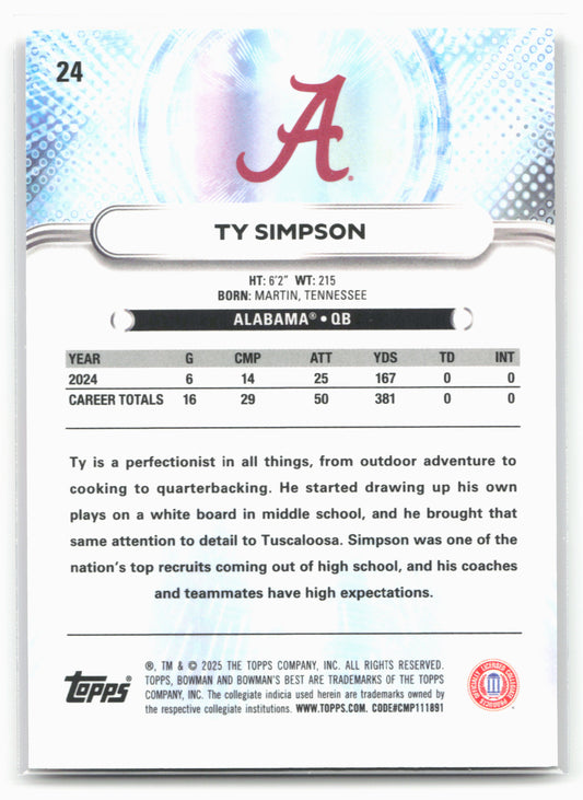 This is a nice example of a 2025 Bowman University Best #24 Ty Simpson Other important information about this card:In 2025 Ty Simpson played for the Alabama Crimson Tide.Please check...