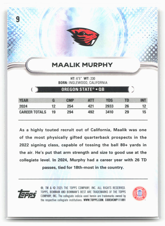 This is a nice example of a 2025 Bowman University Best #9 Maalik Murphy Other important information about this card:In 2025 Maalik Murphy played for the Oregon State Beavers.Please check...
