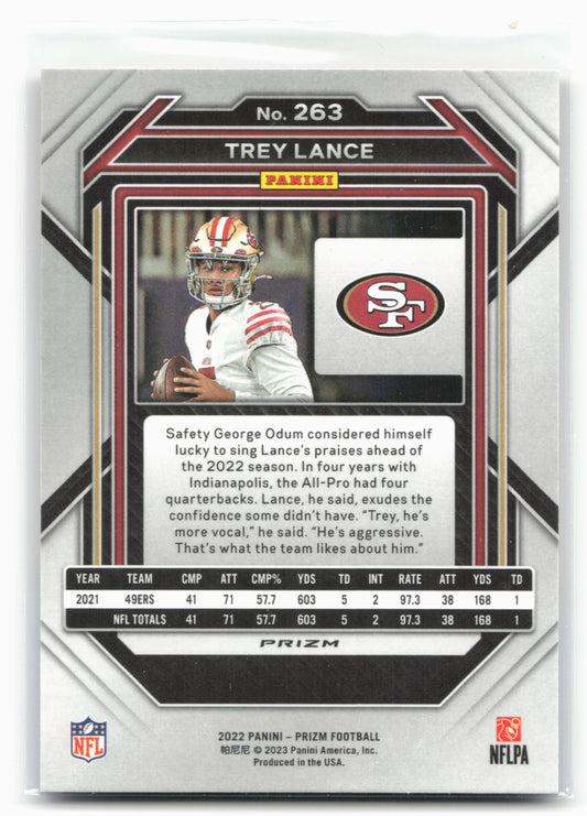 This is a nice example of a 2022 Panini Prizm #263 Trey Lance Red White and Blue Other important information about this card:In 2022 Trey Lance played for the San...