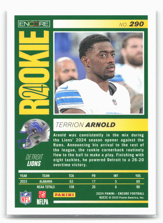 This is a nice example of a 2024 Panini Encore #290 Terrion Arnold Other important information about this card:RCIn 2024 Terrion Arnold played for the Detroit Lions.Please check out our...