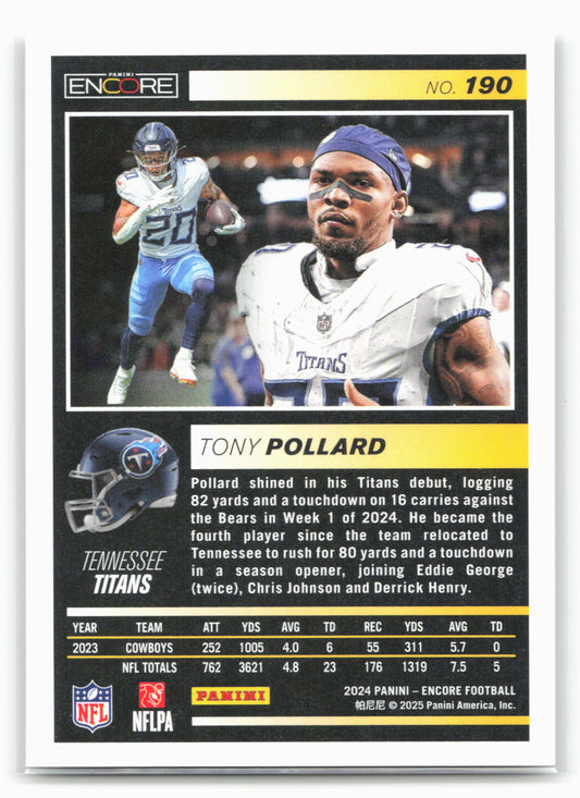 This is a nice example of a 2024 Panini Encore #190 Tony Pollard Other important information about this card:In 2024 Tony Pollard played for the Tennessee Titans.Please check out our...