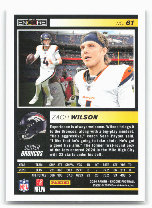 This is a nice example of a 2024 Panini Encore #61 Zach Wilson Other important information about this card:In 2024 Zach Wilson played for the Denver Broncos.Please check out our...