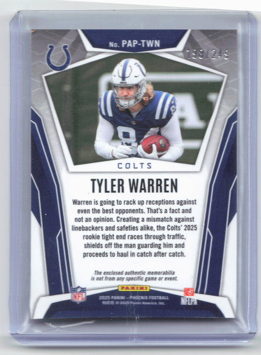 This is a nice example of a 2025 Panini Phoenix #PAP-TWN Tyler Warren Pandora Patch Red Prizm Other important information about this card:SN,MEMIn 2025 Tyler Warren played for the Indianapolis...
