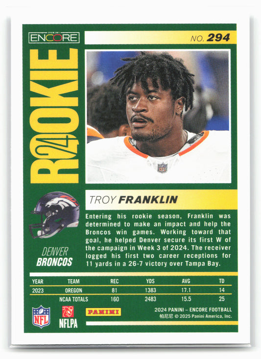 This is a nice example of a 2024 Panini Encore #294 Troy Franklin Other important information about this card:RCIn 2024 Troy Franklin played for the Denver Broncos.Please check out our...