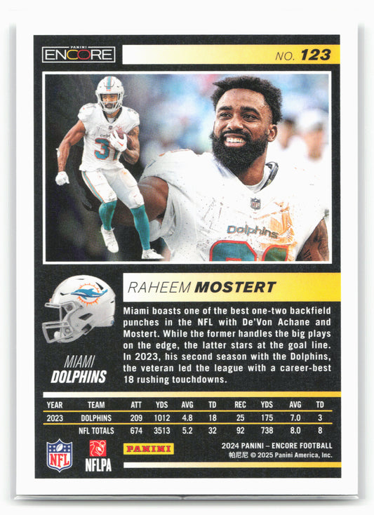 This is a nice example of a 2024 Panini Encore #123 Raheem Mostert Other important information about this card:In 2024 Raheem Mostert played for the Miami Dolphins.Please check out our...