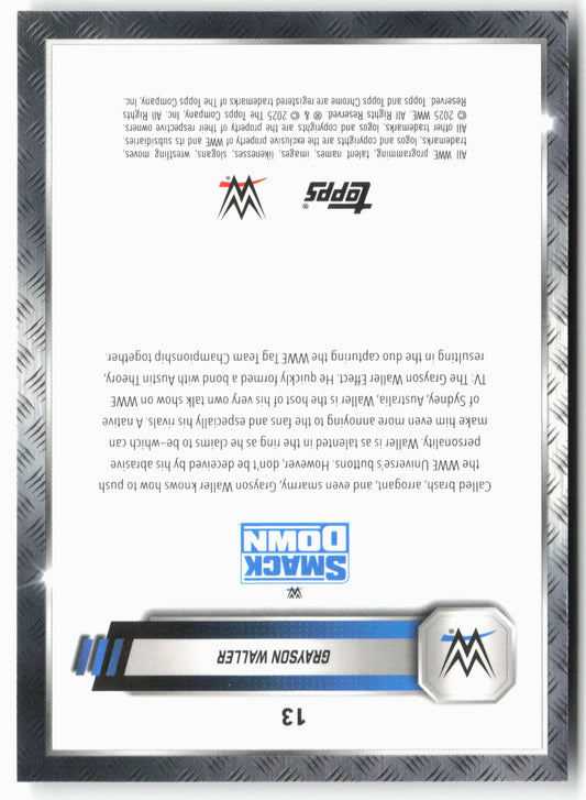 This is a nice example of a 2025 Topps Chrome WWE #13 Grayson Waller Teal Lazer Refractor Other important information about this card:SNIn 2025 Grayson Waller played for the WWE.Please...