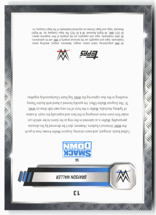 This is a nice example of a 2025 Topps Chrome WWE #13 Grayson Waller Red and Blue Refractor Other important information about this card:In 2025 Grayson Waller played for the...