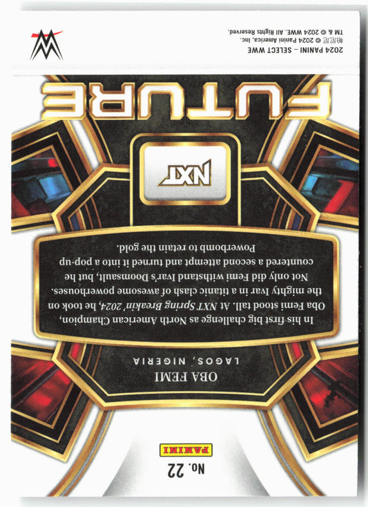 This is a nice example of a 2024 Panini Select WWE #22 Oba Femi Select Future Other important information about this card:In 2024 Oba Femi played for the NXT.Please check...