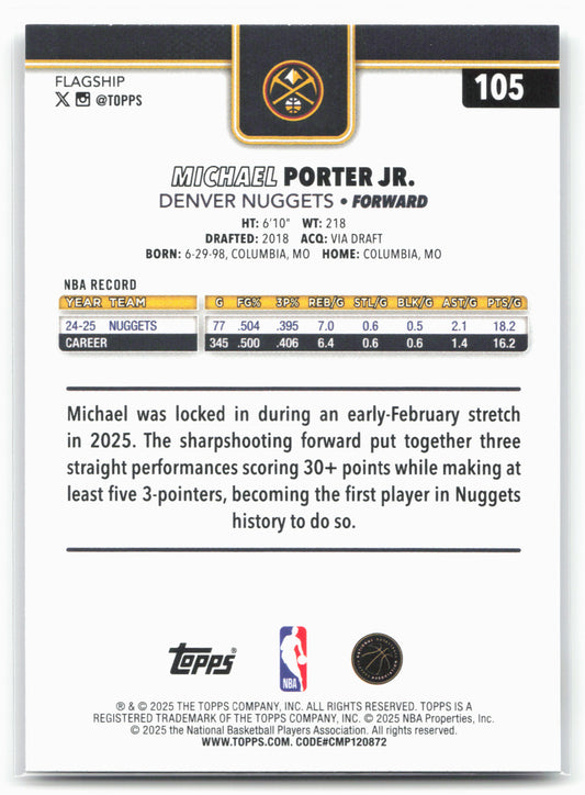 This is a nice example of a 2025-26 Topps #105 Michael Porter Jr. Other important information about this card:In 2025 Michael Porter Jr. played for the Denver Nuggets.Please check out...