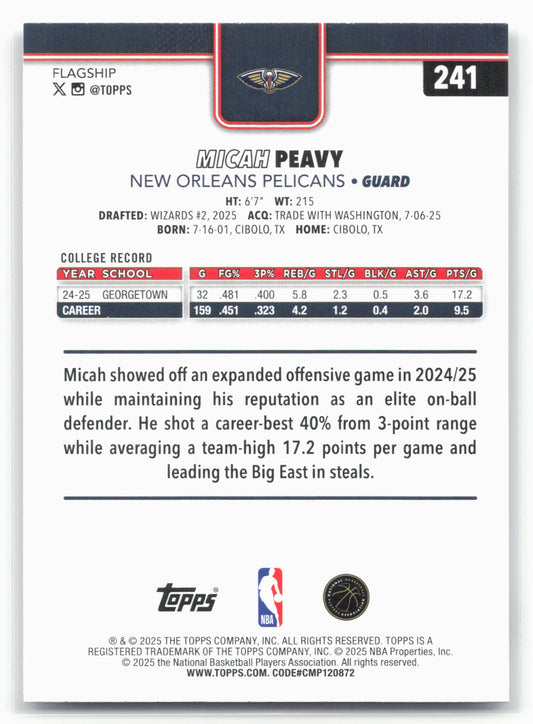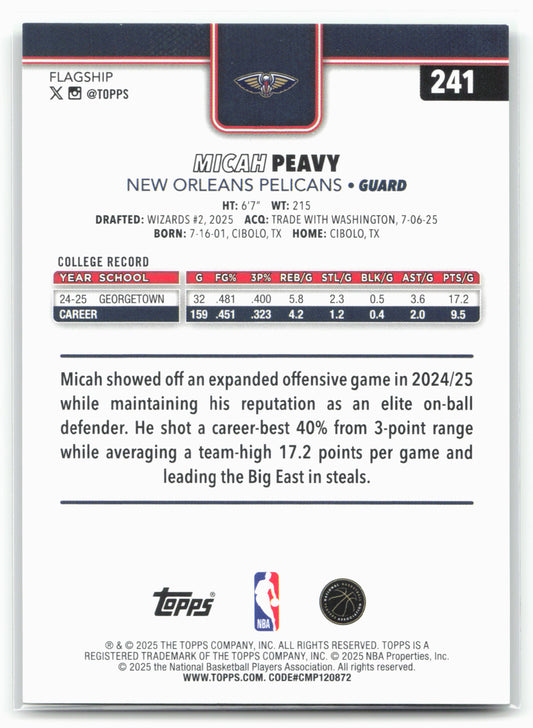 This is a nice example of a 2025-26 Topps #241 Micah Peavy Other important information about this card:RCIn 2025 Micah Peavy played for the New Orleans Pelicans.Please check out our...