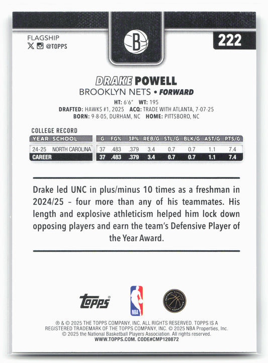 This is a nice example of a 2025-26 Topps #222 Drake Powell Other important information about this card:RCIn 2025 Drake Powell played for the Brooklyn Nets.Please check out our other...