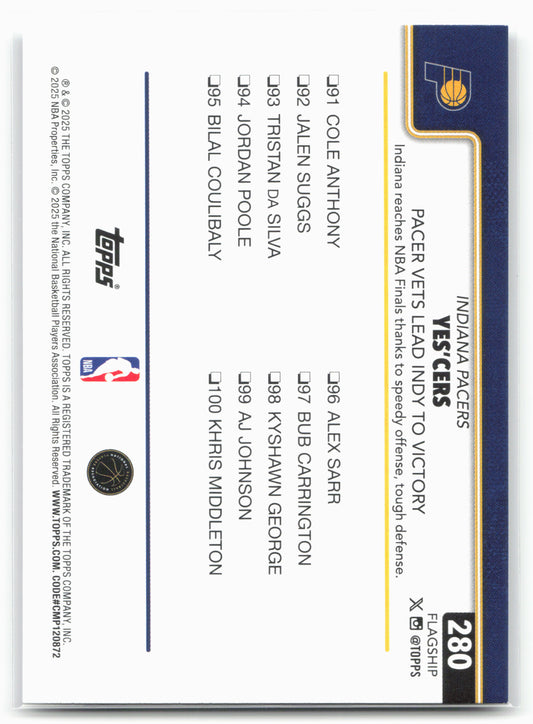 This is a nice example of a 2025-26 Topps #280 Yes'Cers: Pacer Vets Lead Indy To Victory Other important information about this card:In 2025 Yes'Cers: Pacer Vets Lead Indy To...
