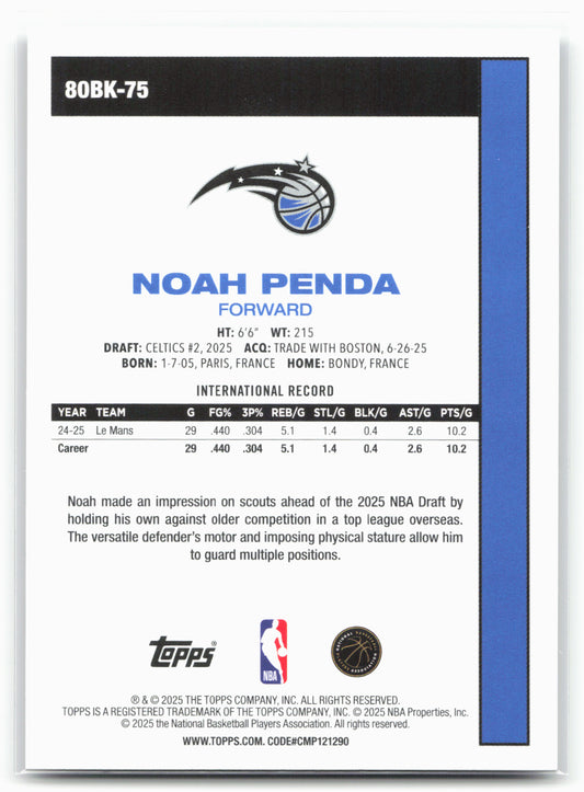 This is a nice example of a 2025-26 Topps #80BK-75 Noah Penda 1980-81 Topps Basketball Other important information about this card:In 2025 Noah Penda played for the Orlando Magic.Please check...
