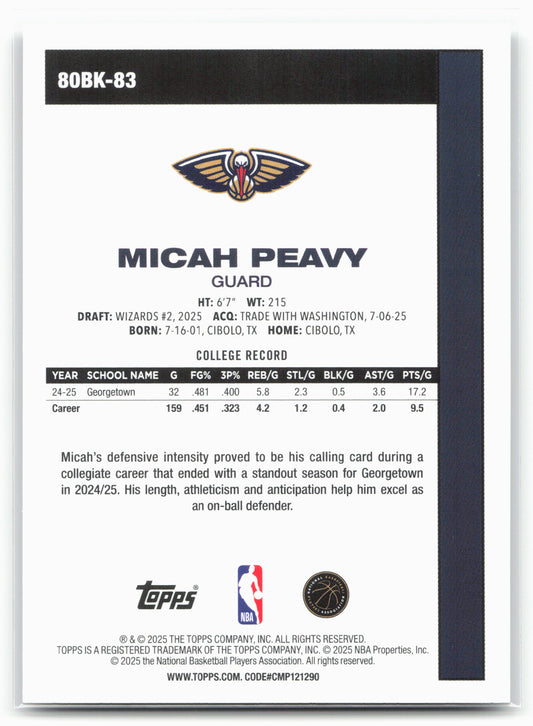 This is a nice example of a 2025-26 Topps #80BK-83 Micah Peavy 1980-81 Topps Basketball Other important information about this card:In 2025 Micah Peavy played for the New Orleans Pelicans.Please...