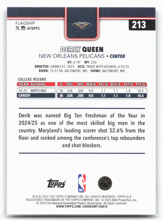 This is a nice example of a 2025-26 Topps #213 Derik Queen Other important information about this card:RCIn 2025 Derik Queen played for the New Orleans Pelicans.Please check out our...