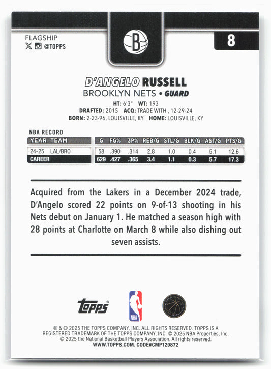 This is a nice example of a 2025-26 Topps #8 D'Angelo Russell Other important information about this card:In 2025 D'Angelo Russell played for the Brooklyn Nets.Please check out our other...