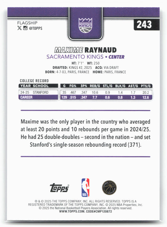 This is a nice example of a 2025-26 Topps #243 Maxime Raynaud Other important information about this card:RCIn 2025 Maxime Raynaud played for the Sacramento Kings.Please check out our other...