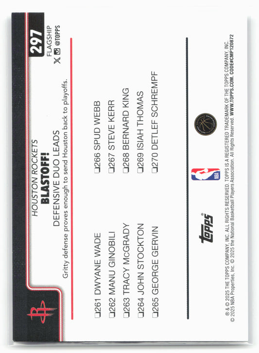 This is a nice example of a 2025-26 Topps #297 Blastoff!: Defensive Duo Leads Other important information about this card:In 2025 Blastoff!: Defensive Duo Leads played for the Houston Rockets.Please...