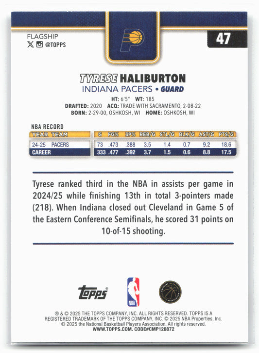 This is a nice example of a 2025-26 Topps #47 Tyrese Haliburton Other important information about this card:In 2025 Tyrese Haliburton played for the Indiana Pacers.Please check out our other...