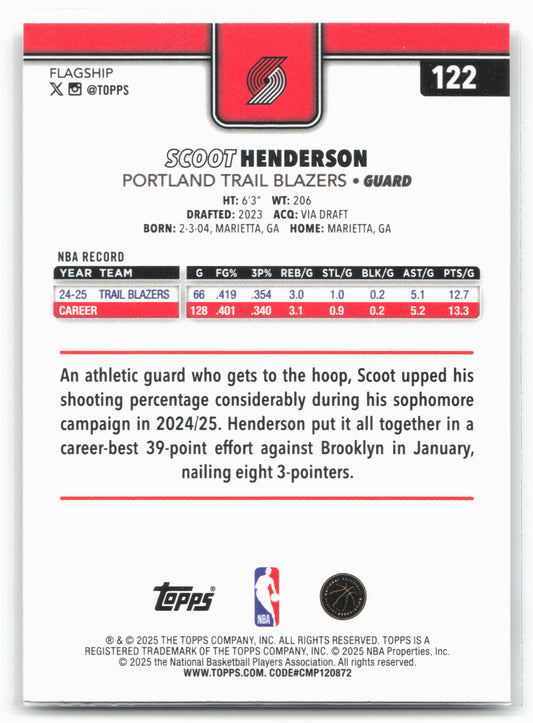 This is a nice example of a 2025-26 Topps #122 Scoot Henderson Other important information about this card:In 2025 Scoot Henderson played for the Portland Trail Blazers.Please check out our...